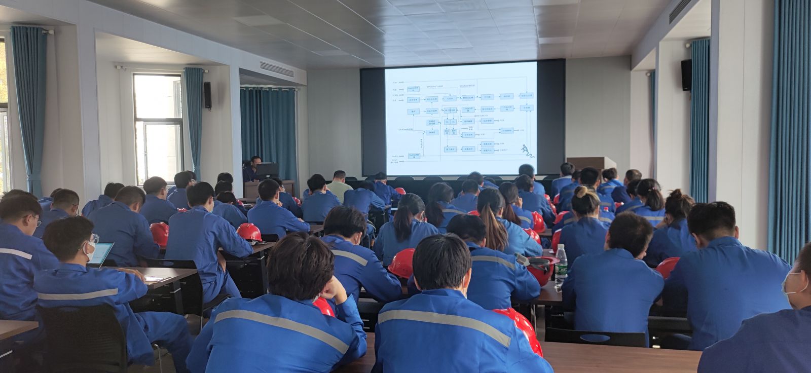 學生在職工培訓室觀看了公司宣傳片,公司組織專人對學生進行了企業文化、安全與工藝培訓。經過培訓后學生分為3組,分別到氯堿和加氫生產線進行輪崗式專業知識培訓。